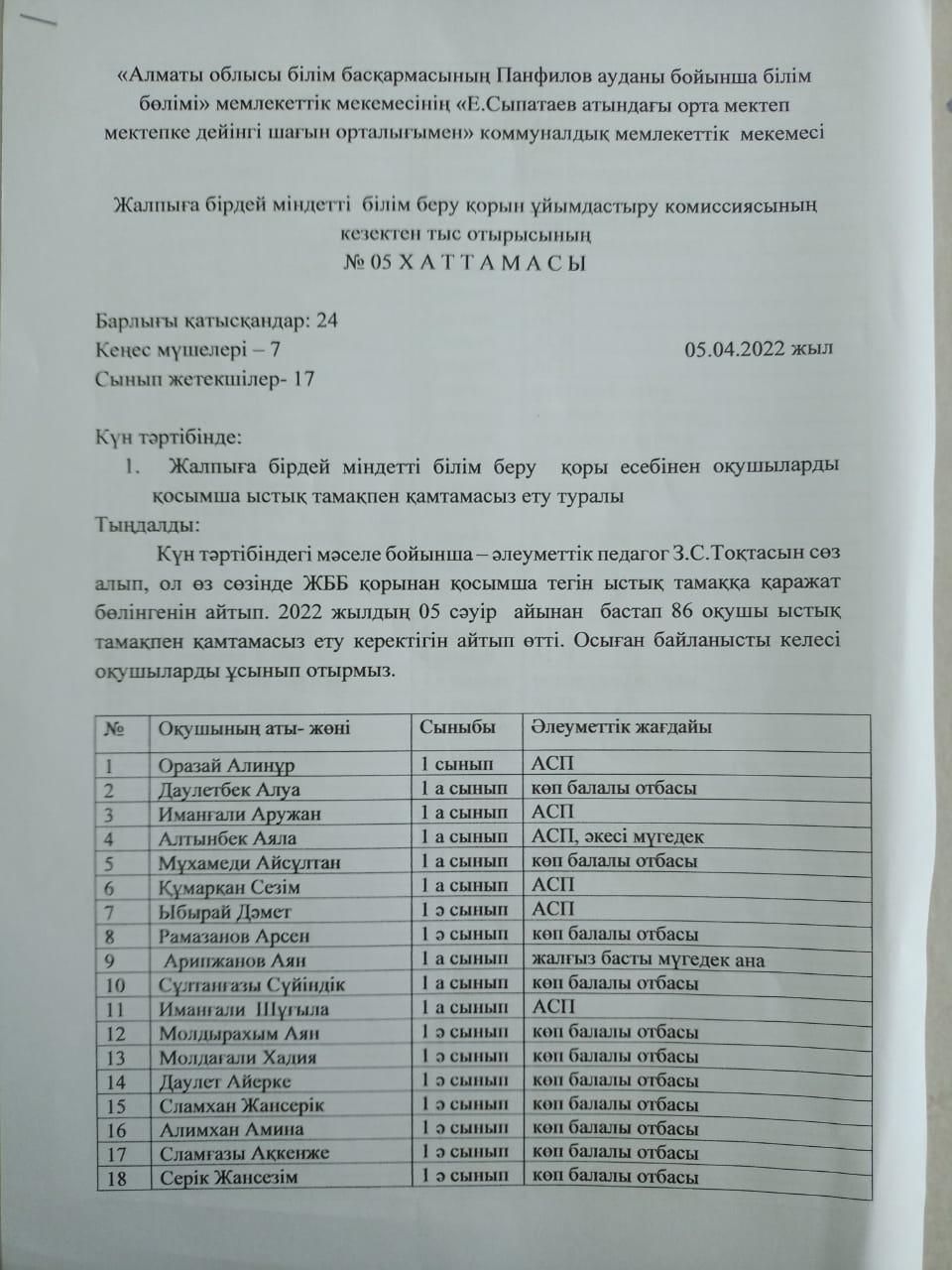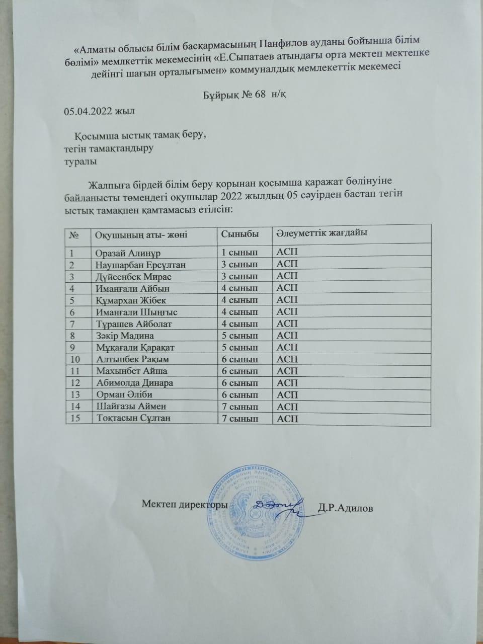 Ыстық тамақ ішетін оқушылар тізімі, бұйрығы, хаттамасы 2021-2022 оқу жылы » Е.Сыпатаев атындағы орта мектебі